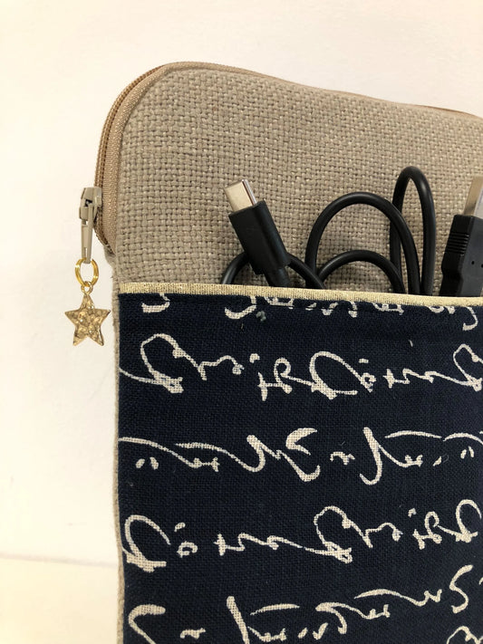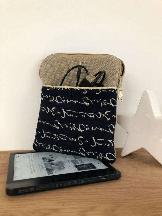 Pochette liseuse en lin et tissu japonais bleu nuit écritures