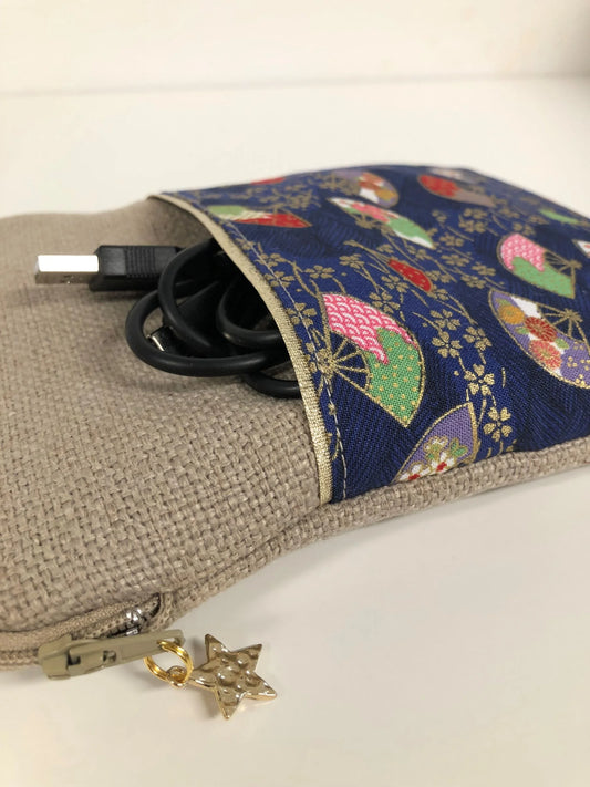 Pochette liseuse en lin et tissu japonais bleu éventails