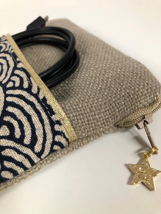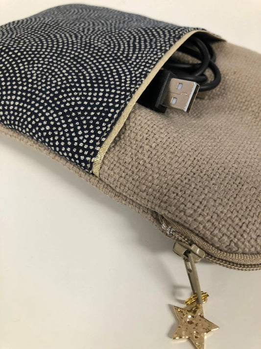 Pochette liseuse en lin et tissu japonais Seigaiha écru et bleu