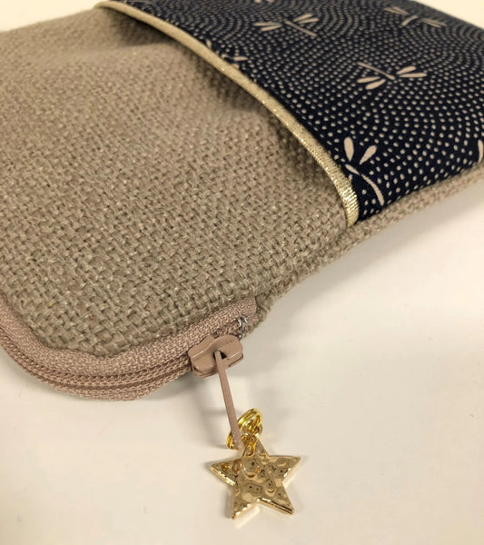 Pochette liseuse en lin et tissu japonais bleu Komon Libellules