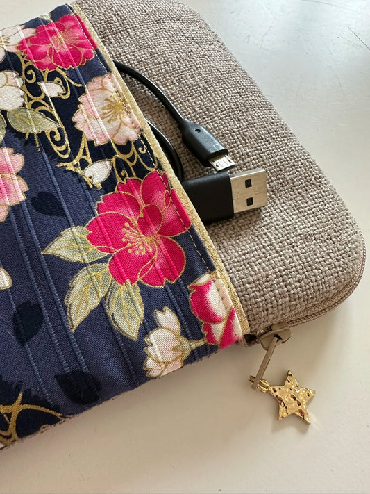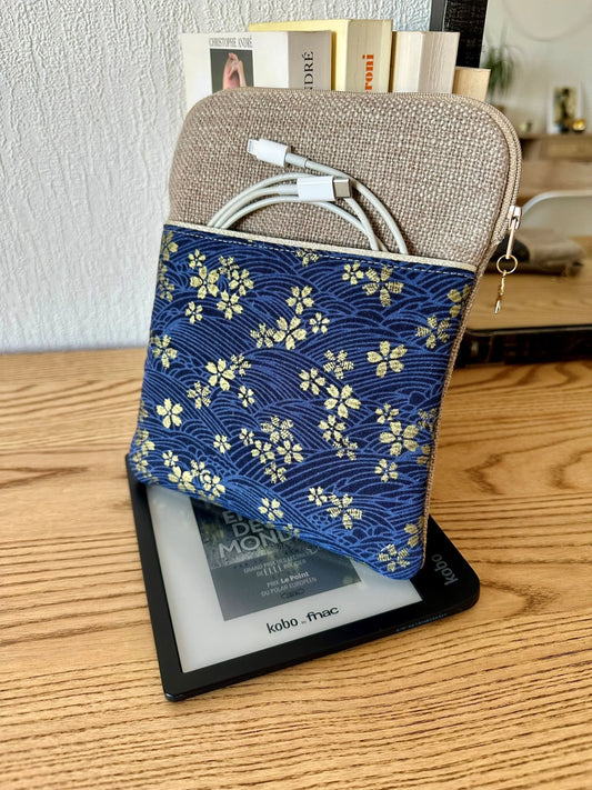Pochette liseuse en lin et tissu japonais Sakura bleu