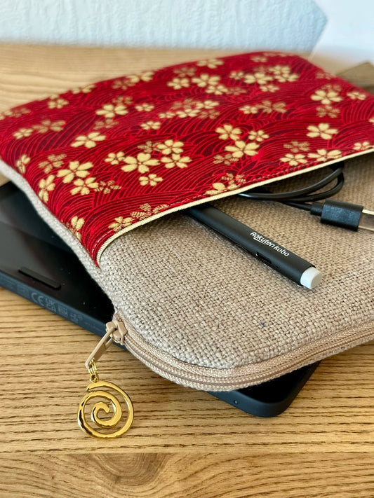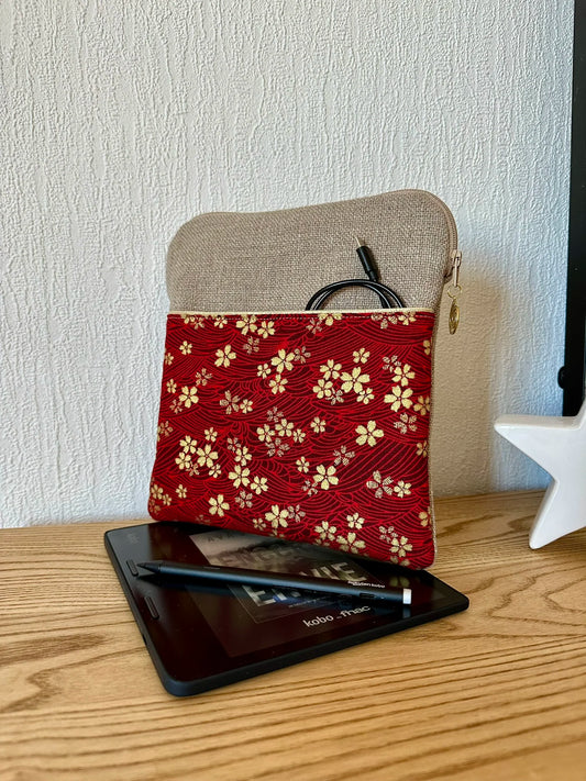 Pochette liseuse en lin et tissu japonais Sakura rouge et doré