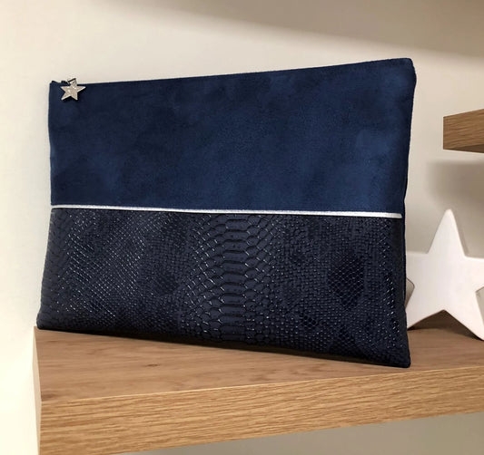 Pochette ordinateur bleu marine et argentée aspect reptile