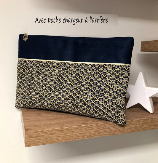 Pochette ordinateur bleu marine en tissu japonais Seigaiha avec poche chargeur
