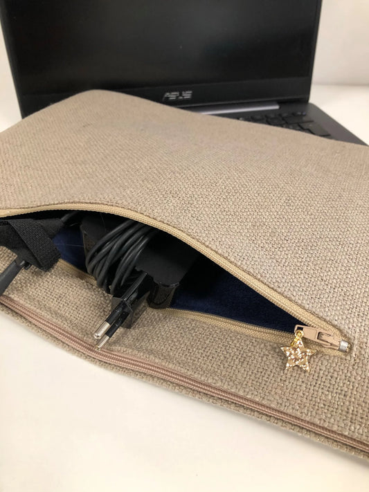 Pochette ordinateur en lin et tissu japonais Seigaiha avec poche chargeur