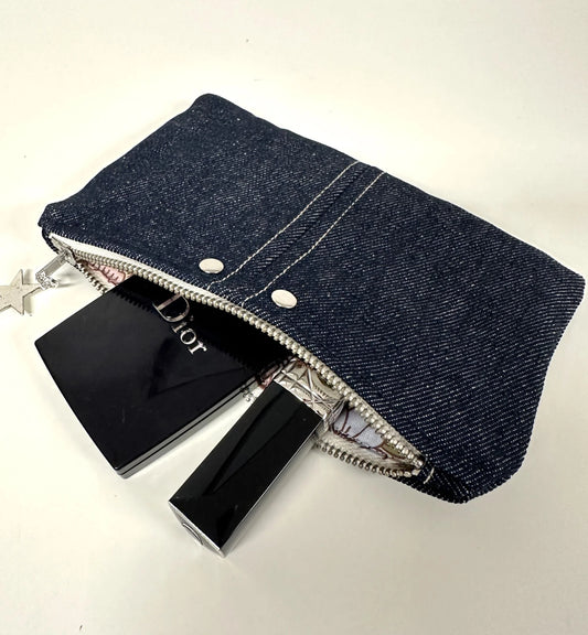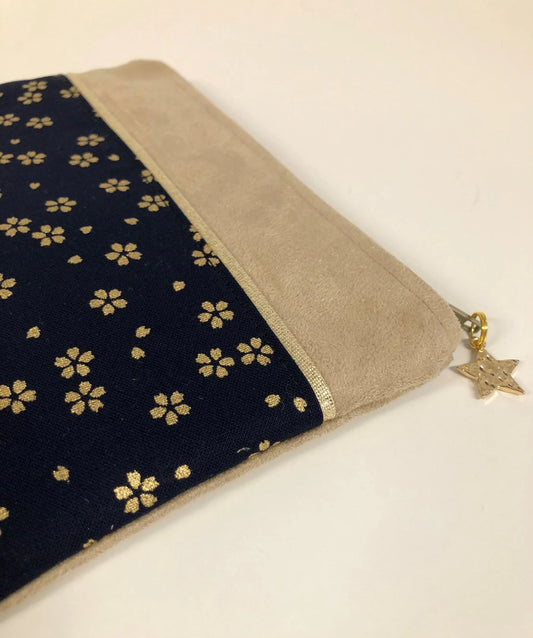 Porte-monnaie beige et bleu nuit en tissu japonais à fleurs dorées