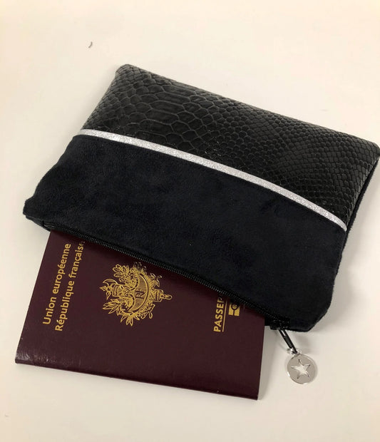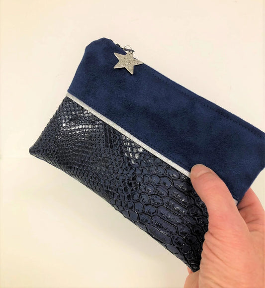 Porte-monnaie bleu marine et argenté en similicuir reptile