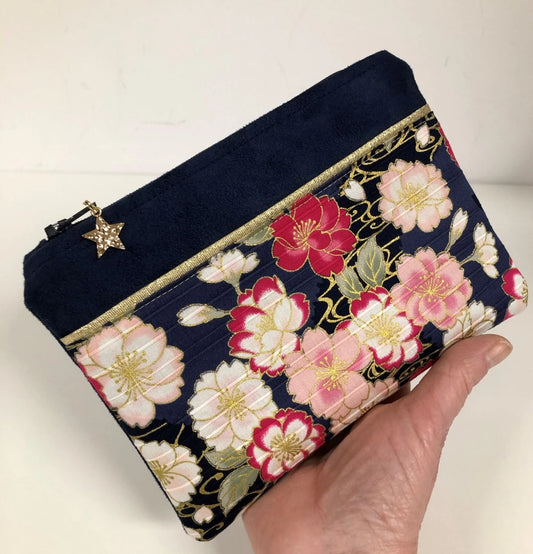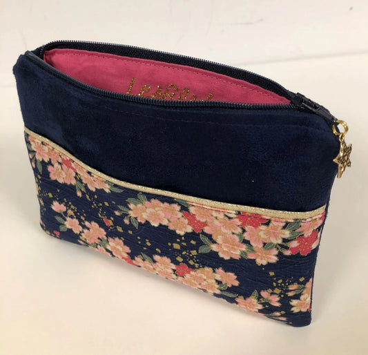 Porte-monnaie bleu marine, rose et doré en tissu japonais pivoines