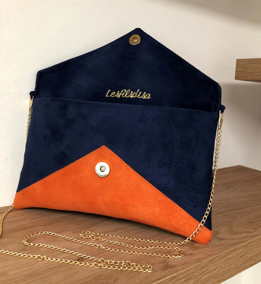 Sac pochette Isa bleu marine et orange à paillettes dorées