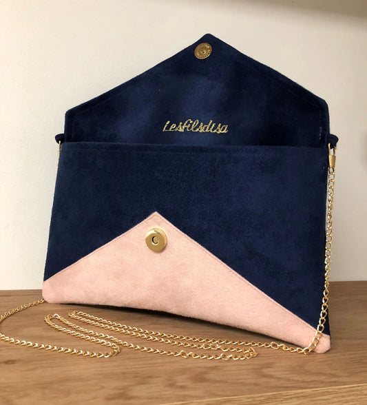 Sac pochette Isa bleu marine et rose poudré à paillettes dorées