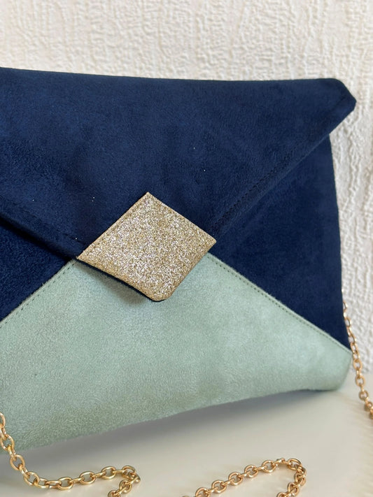Sac pochette Isa bleu marine, vert amande et doré