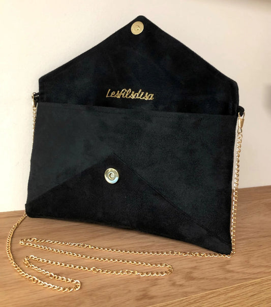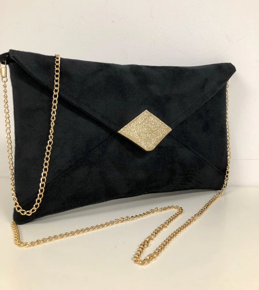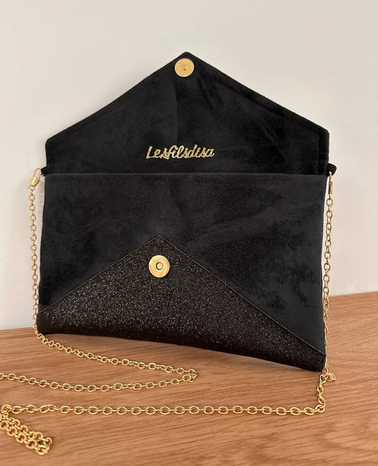 Sac pochette Isa en suédine noire et paillettes dorées