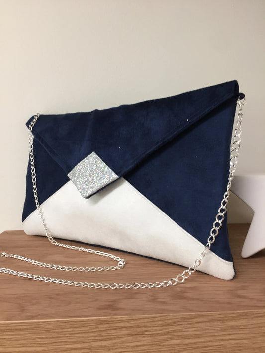 Sac pochette Isa bleu marine et blanc à paillettes argentées