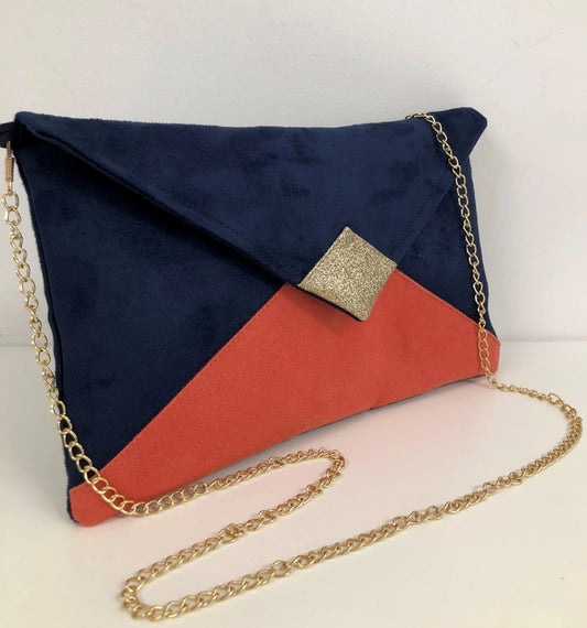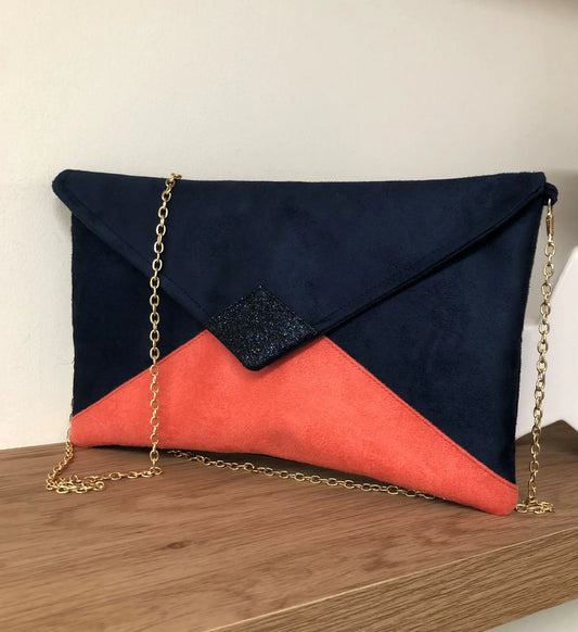 Sac pochette Isa bleu marine et corail à paillettes dorées