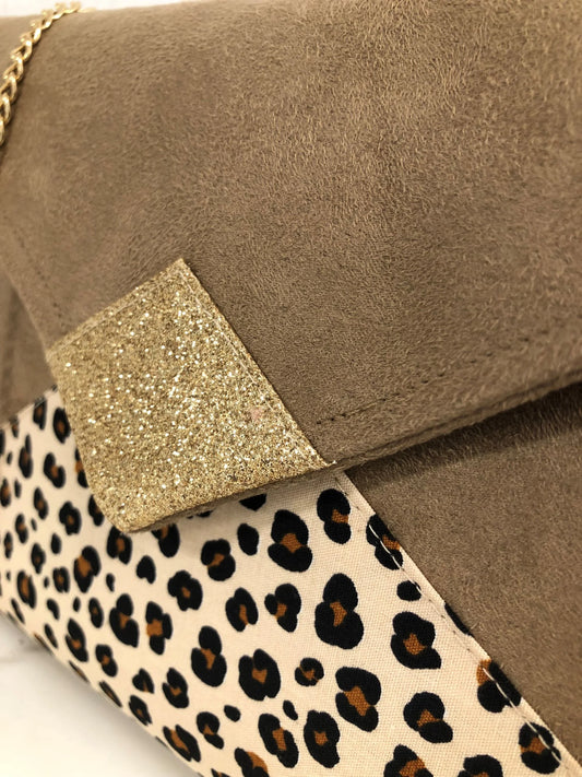Sac pochette Isa camel à motif animal et paillettes dorées