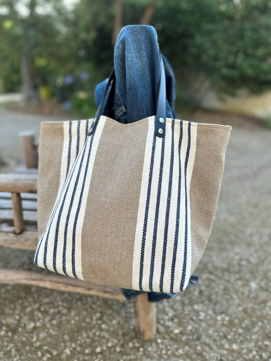 Sac cabas Isa en lin à larges rayures et paillettes noires
