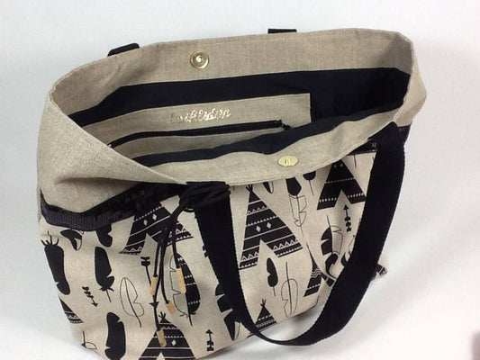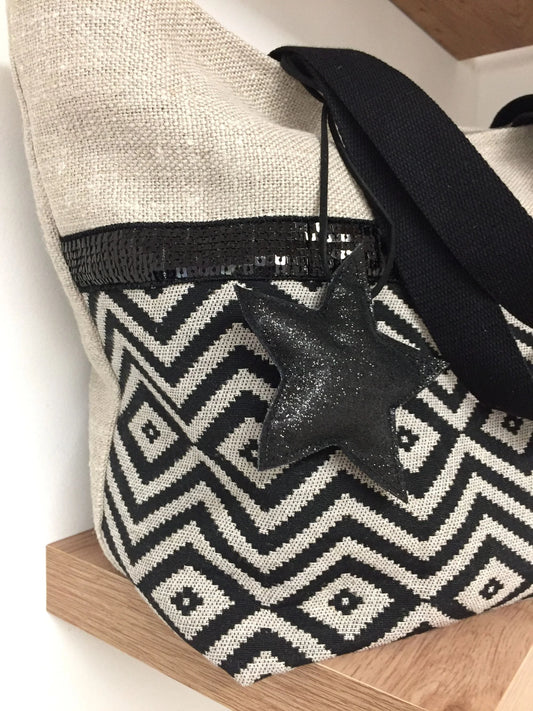 Sac cabas Isa en lin à chevrons noirs et paillettes