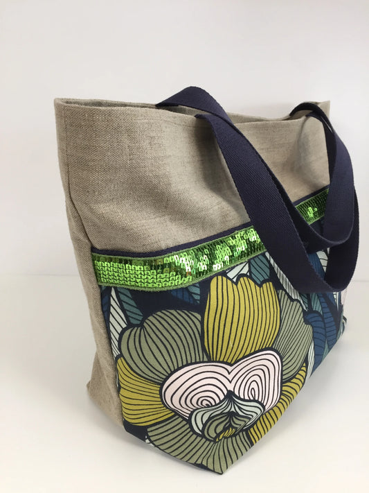 Sas cabas Isa en lin à fleurs Arty et paillettes vertes