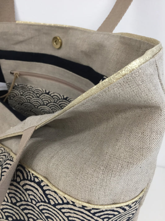 Sac cabas Isa en lin et tissu japonais bleu nuit, beige, doré