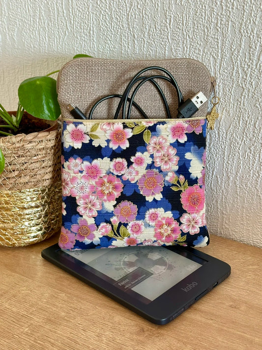 Sakura blue Japanese linen and fabric e-reader pouch
