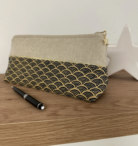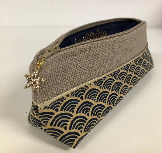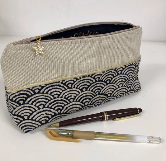 Navy blue and gold Seigaiha Japanese fabric pen case
