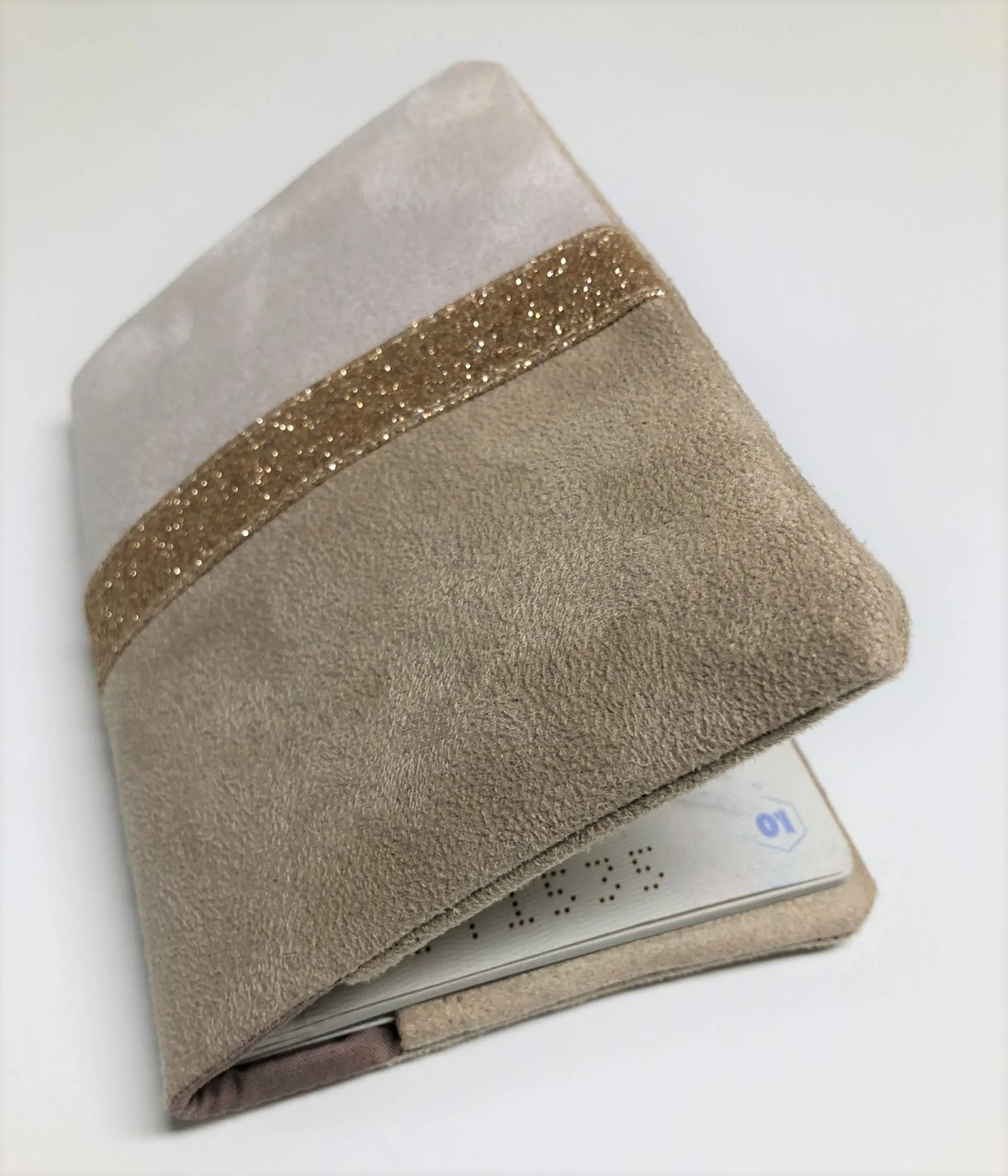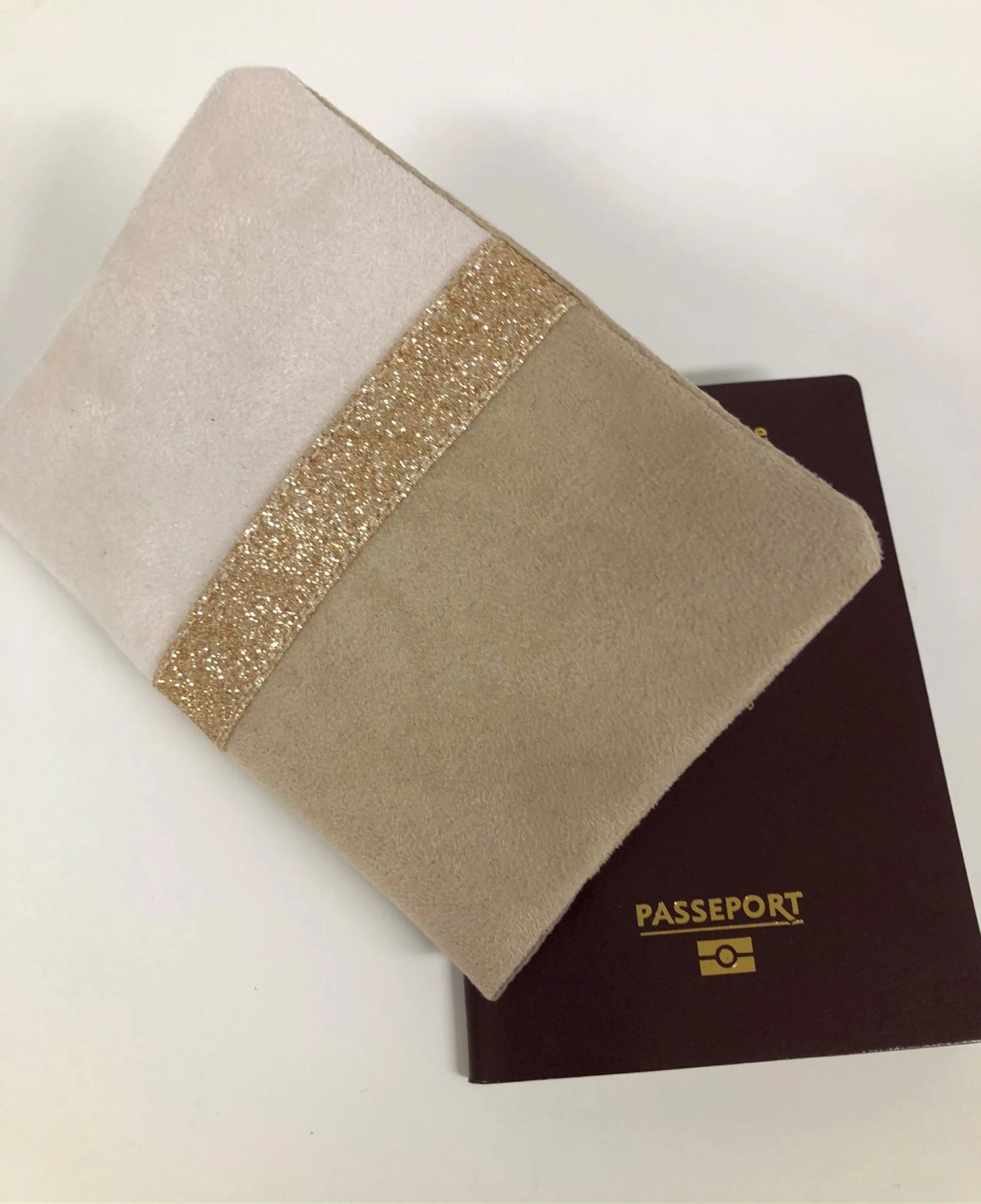 Ecru and beige passport cover with gold sequins
