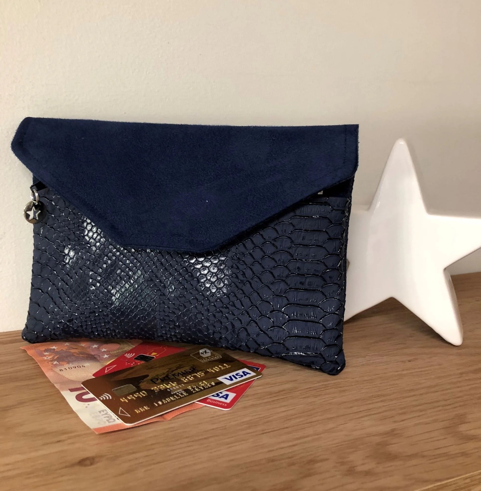 Each Navy Reptile Bag Companion is handmade in my Gard workshop. This versatile bag accessory is crafted from realistic reptile faux leather and super-soft navy suede for a luxurious and elegant look.