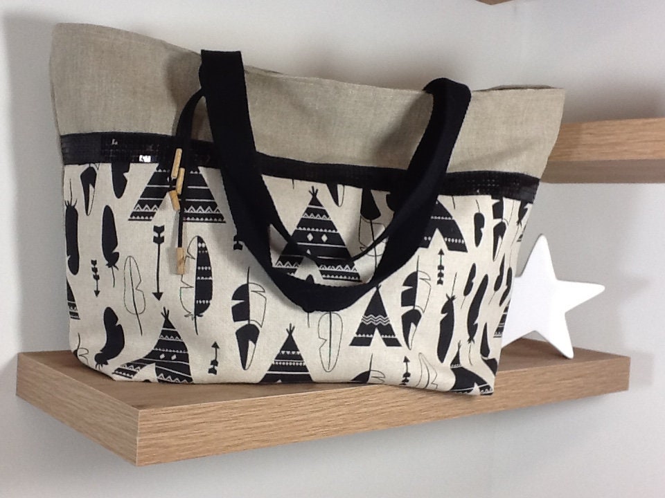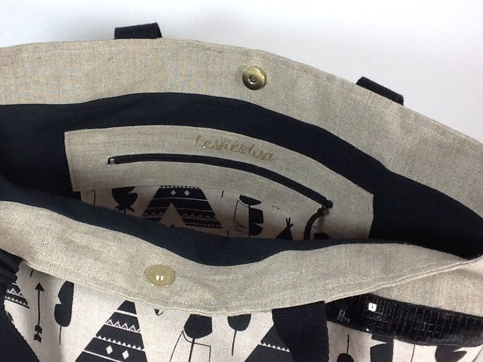Sac cabas Isa en lin à motifs ethnique et paillettes noires