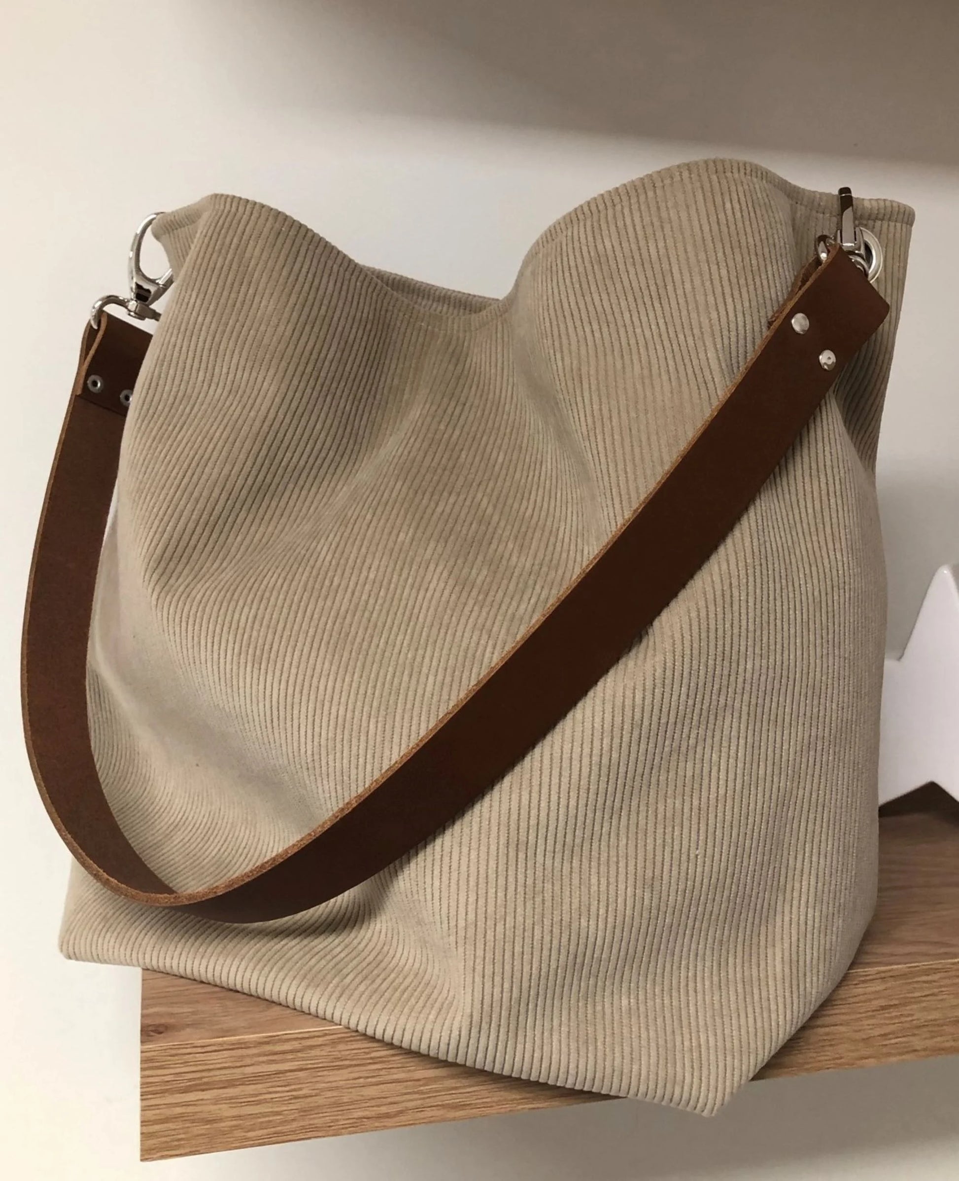Sac Hobo en velours cotelé beige, anse en cuir marron