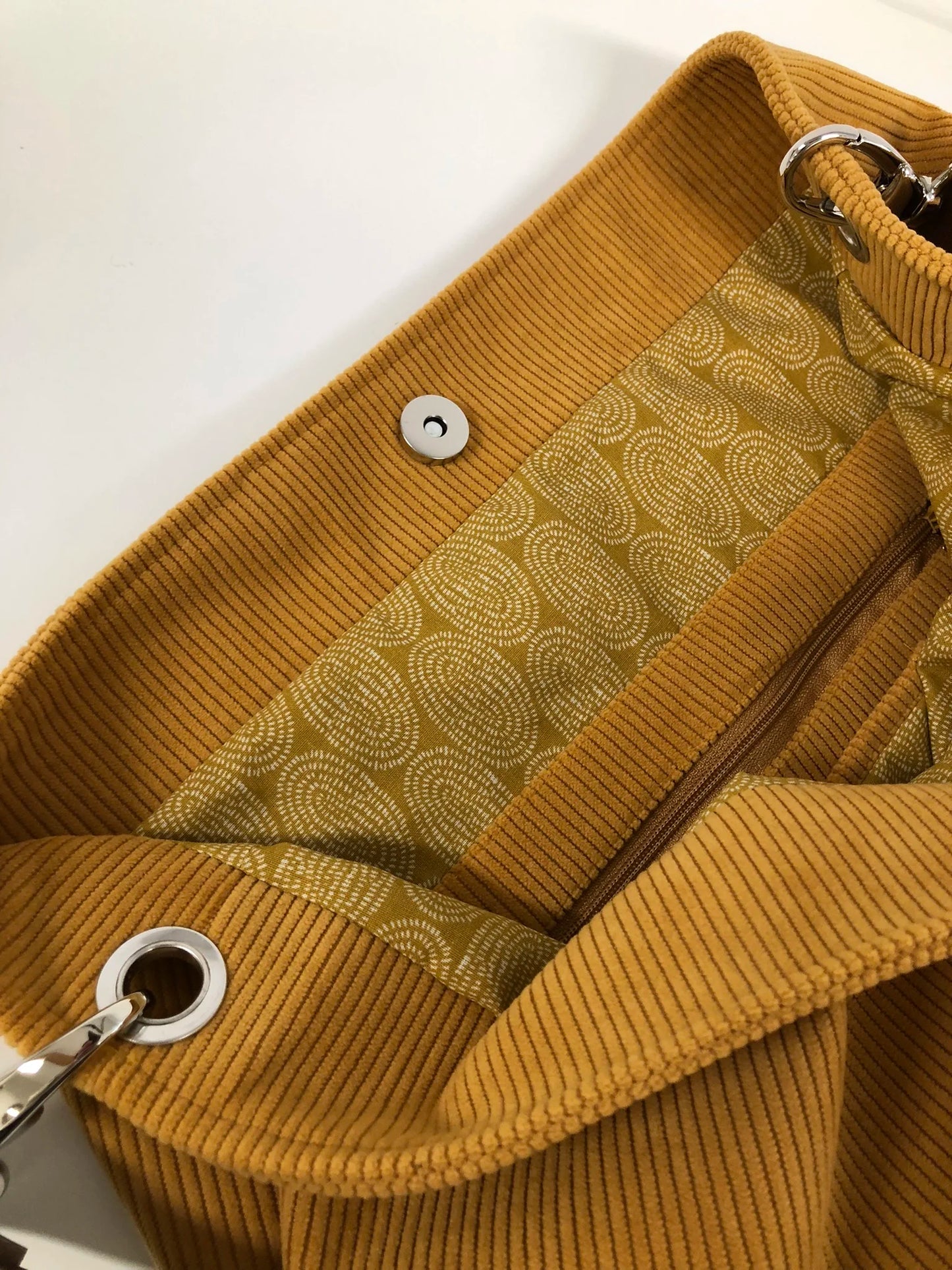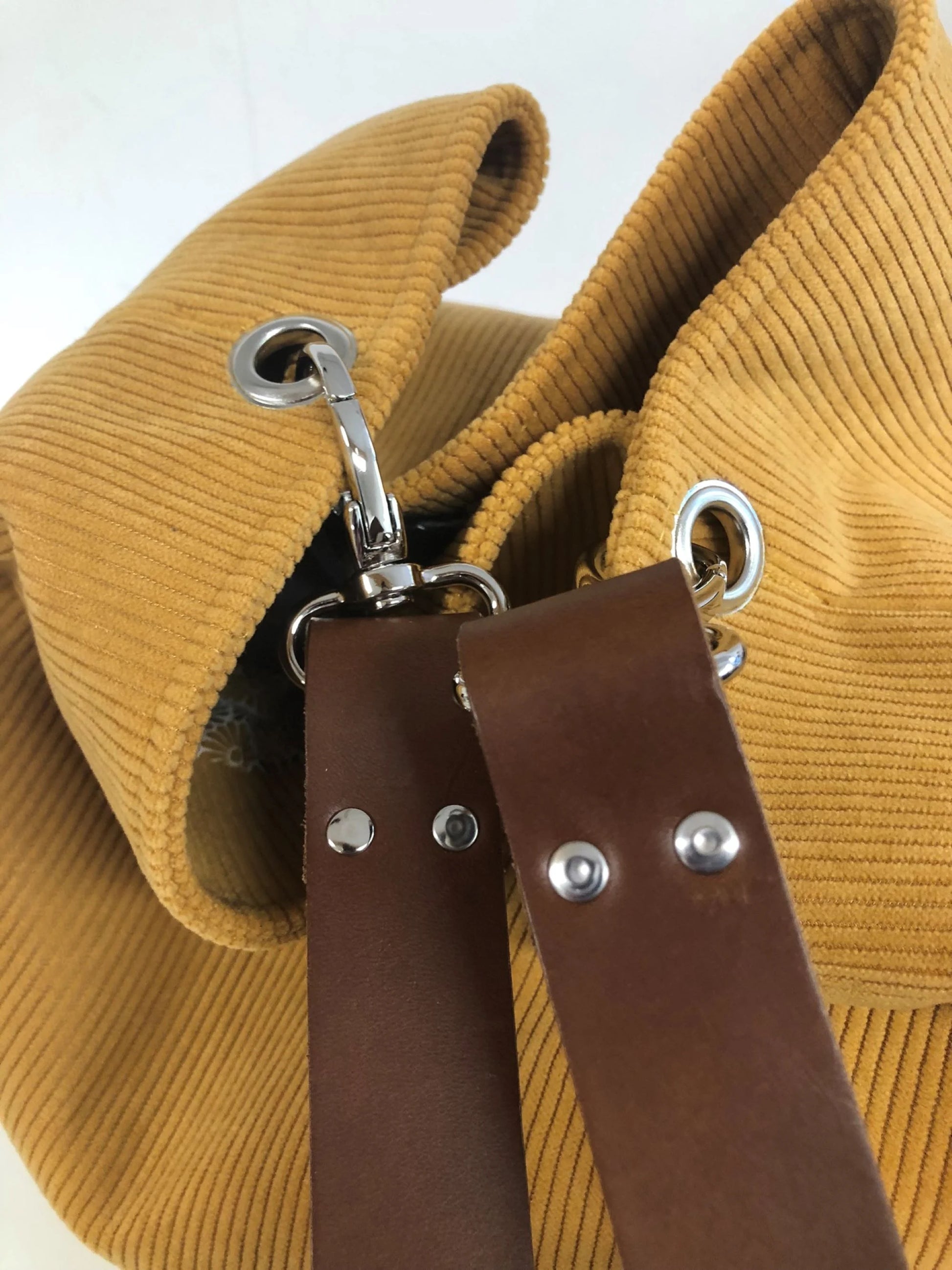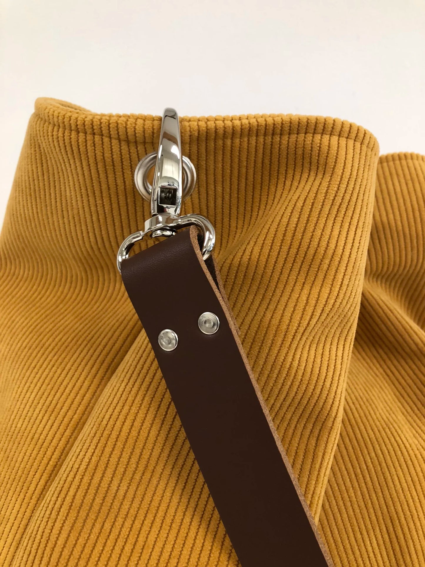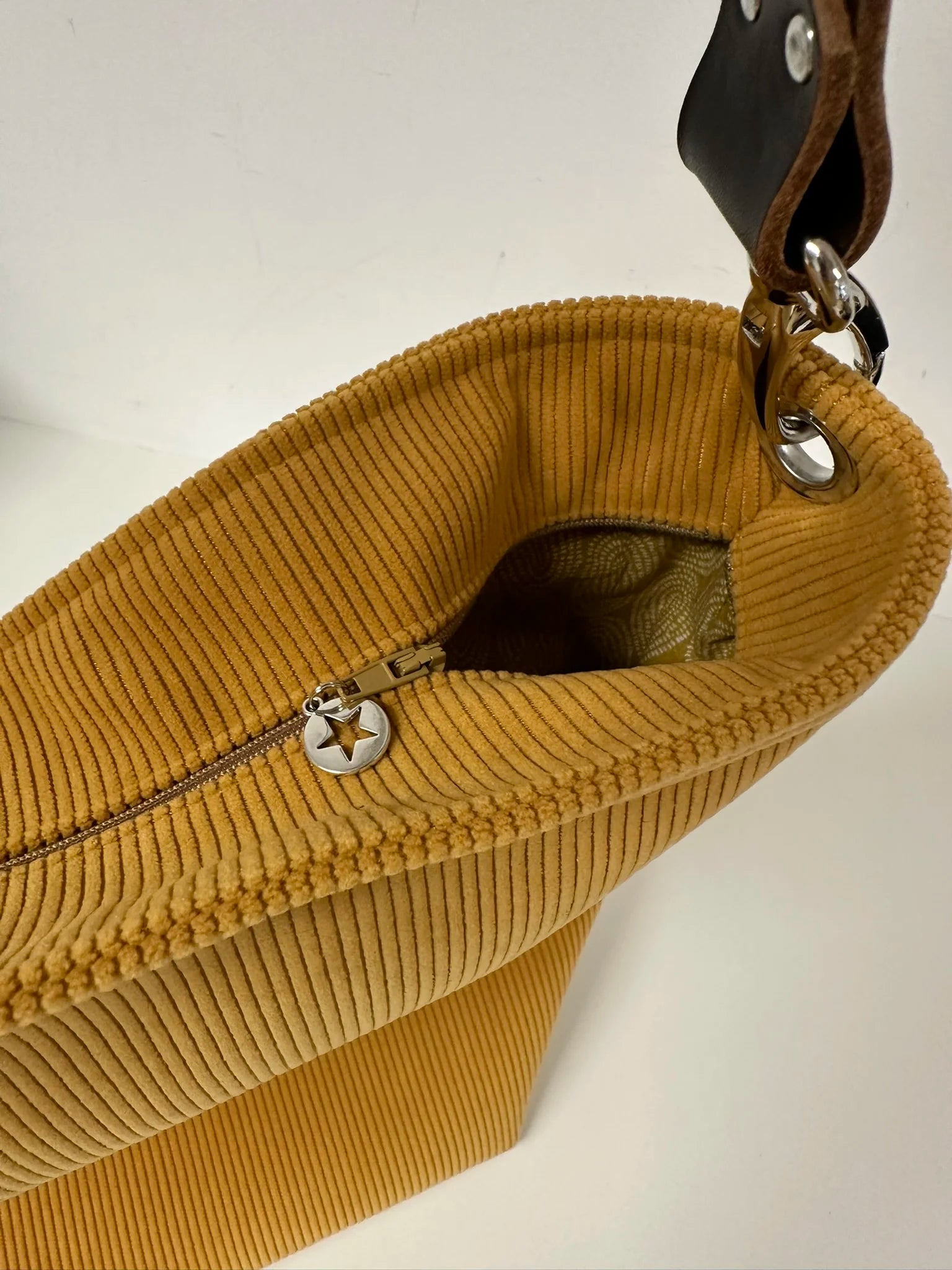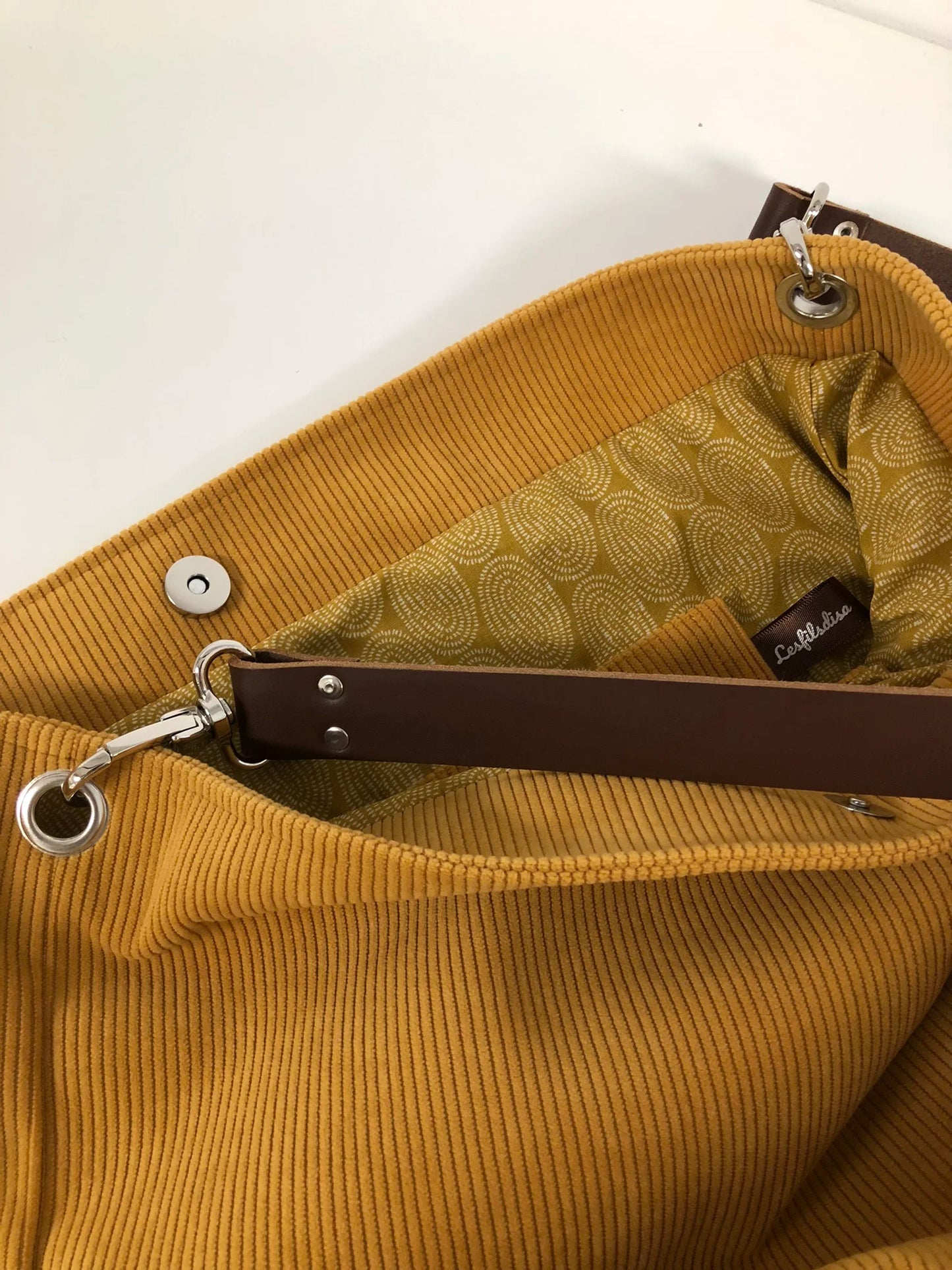 Sac Hobo en velours cotelé jaune moutarde, anse en cuir marron