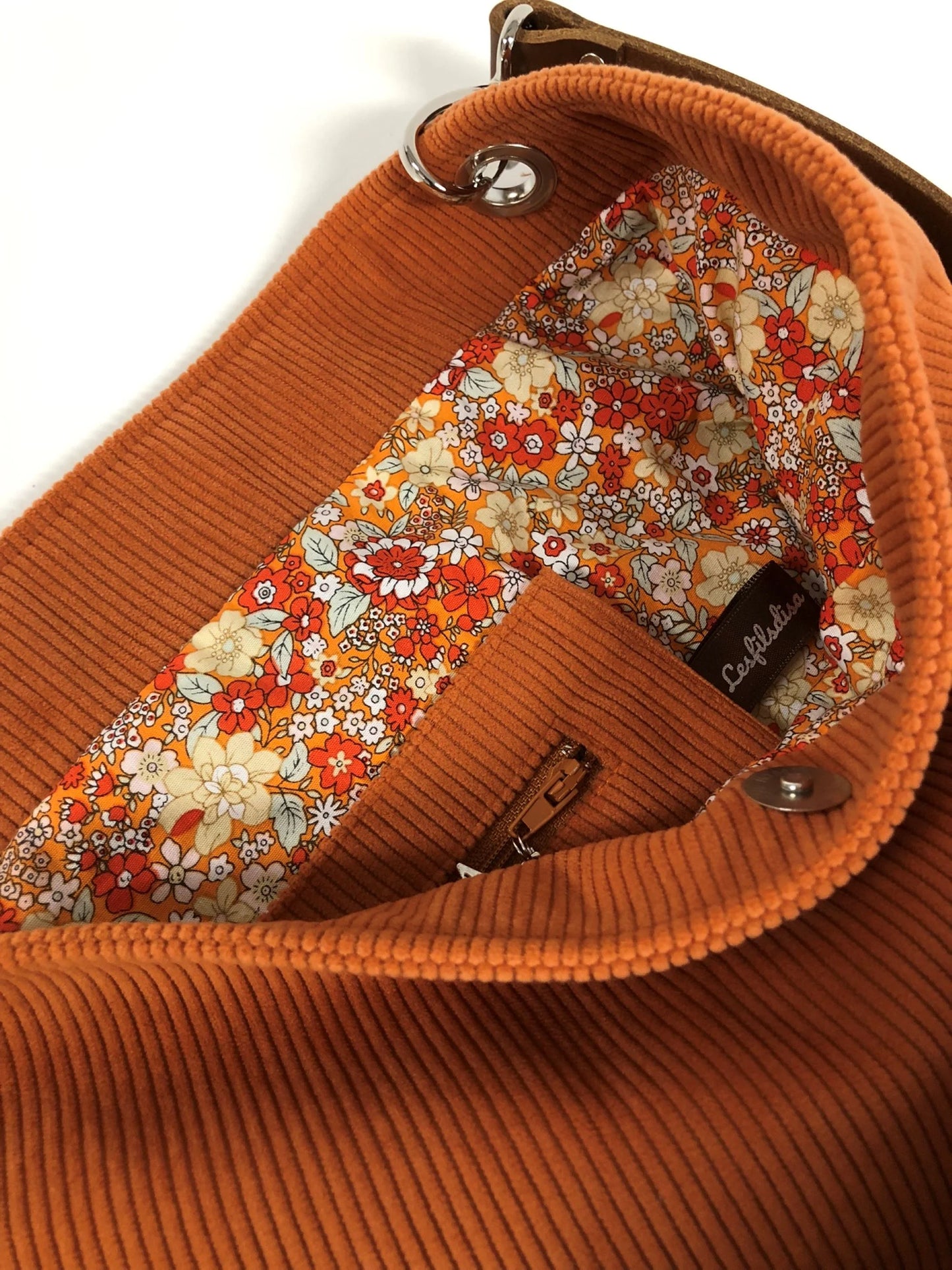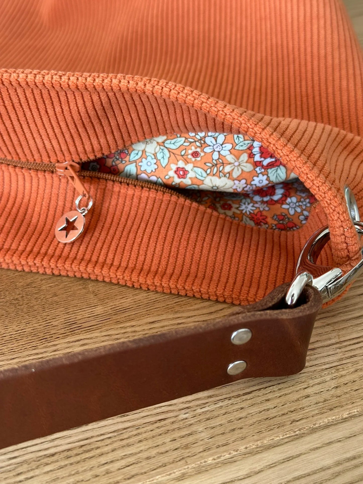 Sac Hobo en velours cotelé orange, anse en cuir marron