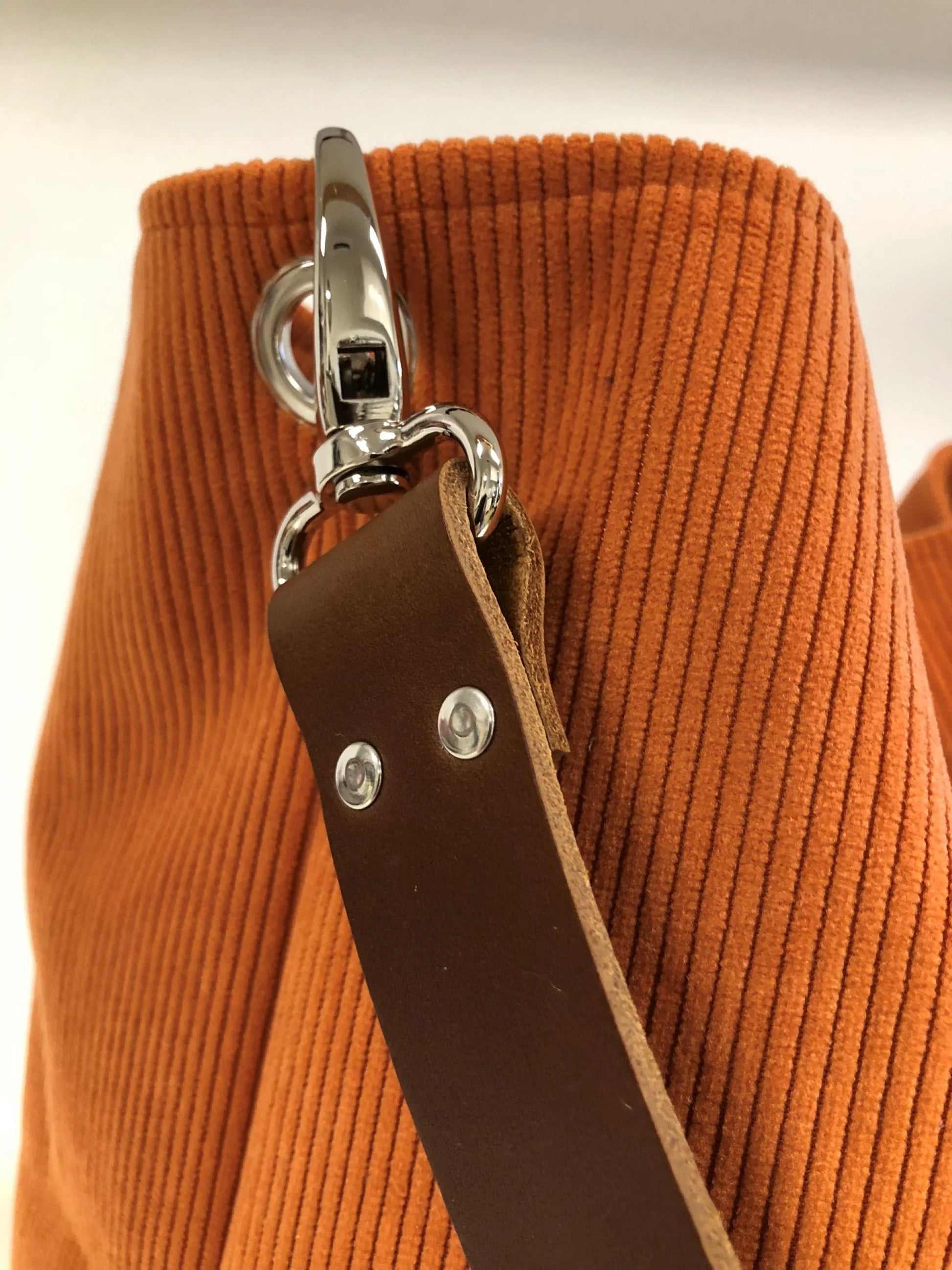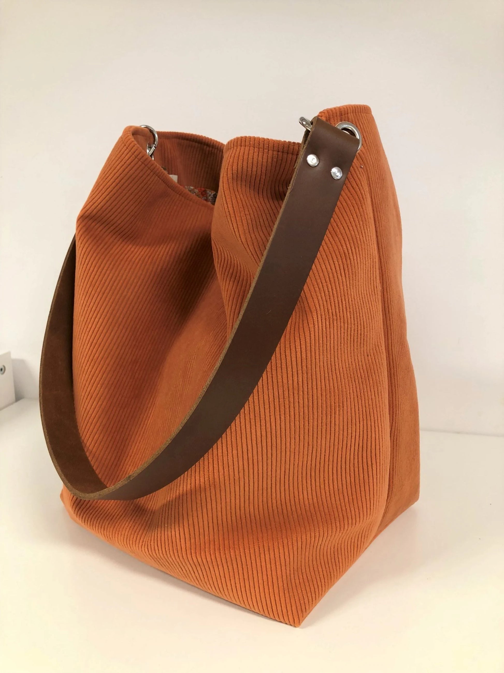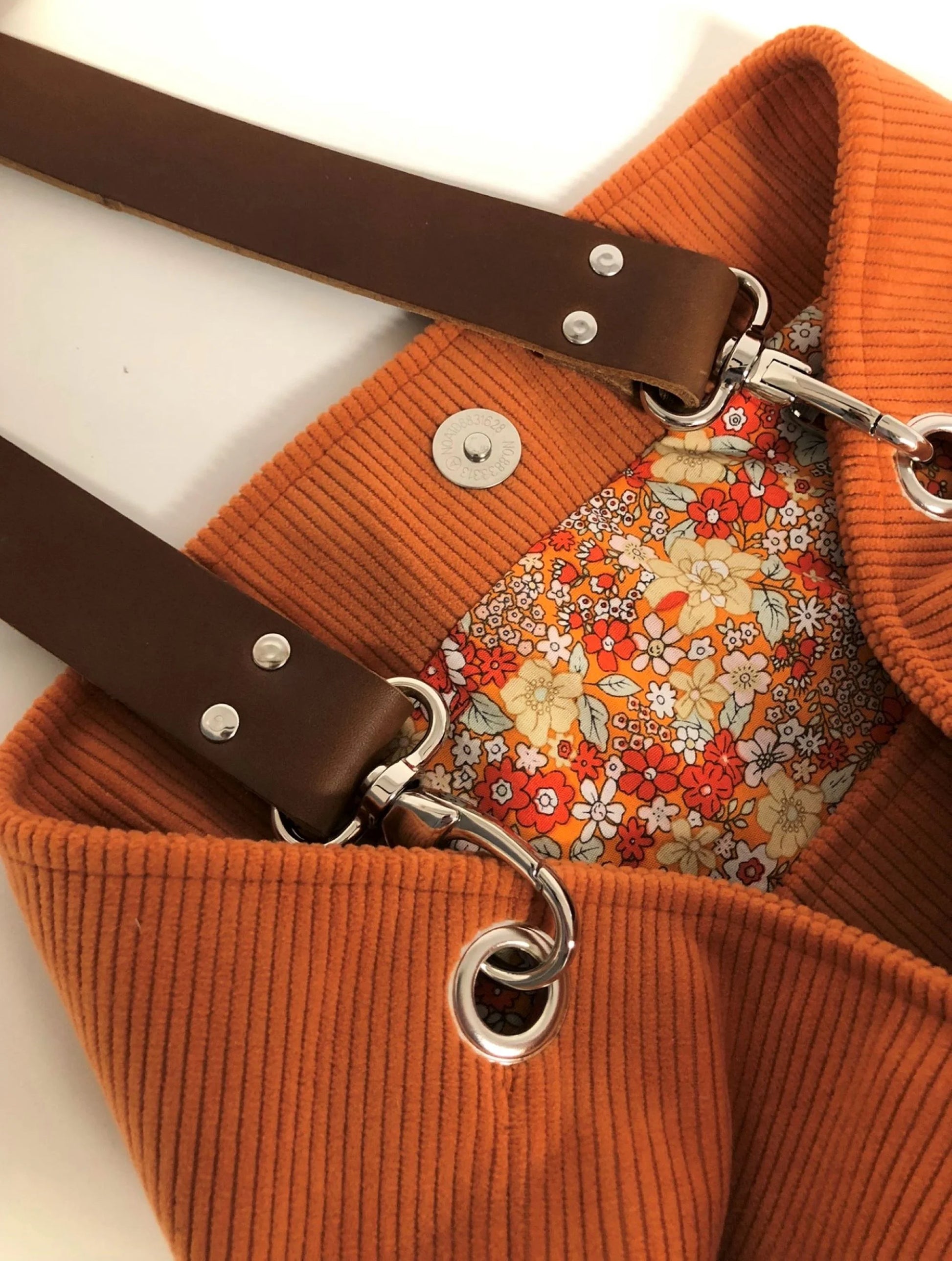 Idéal pour toutes vos sorties, ce sac fourre-tout vous offre suffisamment d'espace pour ranger tous vos indispensables. Le velours cotelé orange ultra doux et le cuir marron se combinent pour créer un sac résistant véritable et durable. À l'intérieur, vous trouverez deux poches plaquées, dont une avec fermeture éclair pour sécuriser vos petites affaires précieuses. La fermeture du sac est assurée par un fermoir magnétique argenté pour un accès rapide et facile à vos effets personnels. la doublure intérieure est en tissu coton imprimé, joliment assortie en fonction des stocks de tissus disponibles au moment de votre achat.