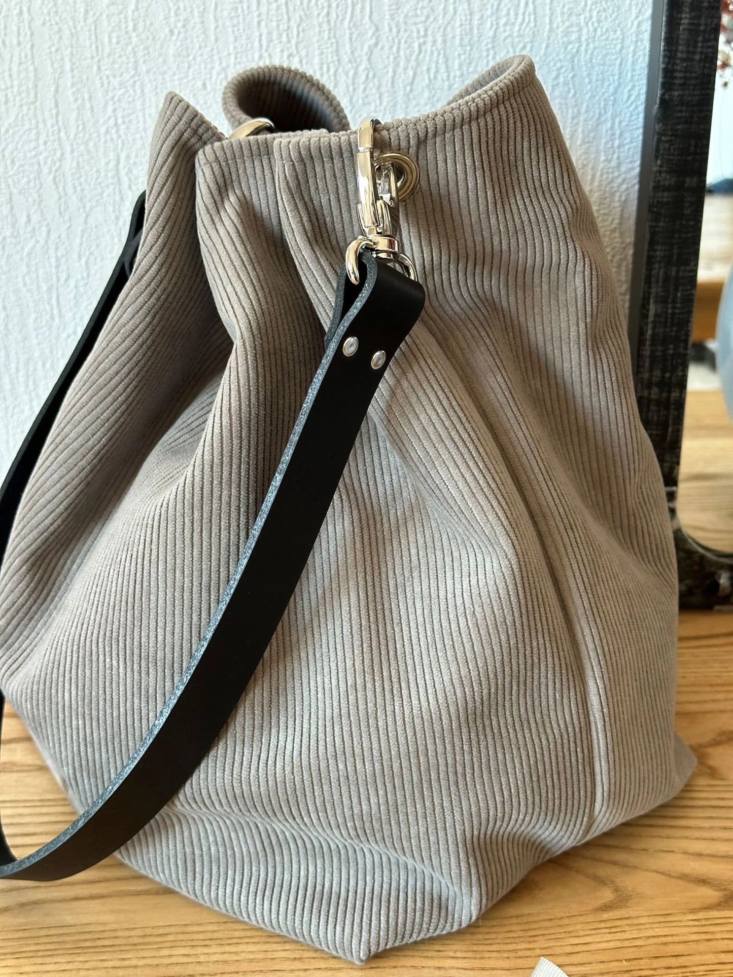 Sac Hobo en velours cotelé taupe, anse en cuir noir